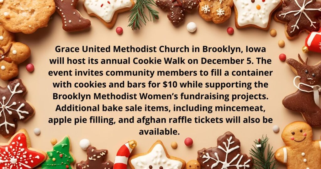 A festive Brooklyn, Iowa tradition returns as Grace UMC hosts its annual Cookie Walk with homemade treats, bake sale items, and community fundraising.