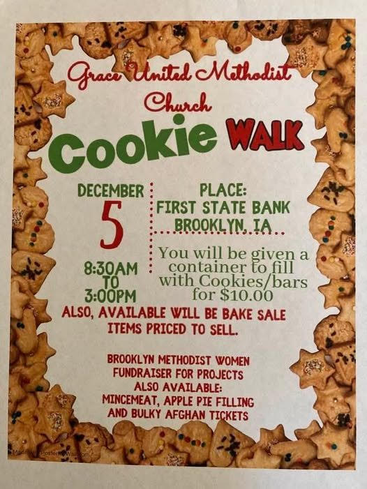 Grace United Methodist Church in Brooklyn, Iowa will host its annual Cookie Walk on December 5. The event invites community members to fill a container with cookies and bars for $10 while supporting the Brooklyn Methodist Women’s fundraising projects. Additional bake sale items; including mincemeat, apple pie filling, and afghan raffle tickets will also be available.